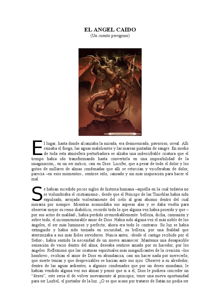 l lugar, hasta donde alcanzaba la mirada, era desmesurado, pavoroso, irreal. All reinaba el fuego, las aguas malolientes y las mareas pintadas de sangre. En medio de toda esta atmsfera perturbadora se alzaba una indescifrable criatura que el tiempo haba ido transformando hasta convertirla en una imposibilidad de la imaginacin,; en un ser mtico, casi en Dios: Lucifer, que a pesar de todo el dolor y los gritos de millares de almas condenadas que all se retorcan y vociferaban de dolor, pareca en esos momentos-, sentirse slo, cansado y sin ms inspiracin para hacer el mal. e haban sucedido pocos siglos de historia humana aquella en la cual todava no se vislumbraba el cristianismo-, desde que el Prncipe de las Tinieblas haba sido expulsado, arrojado violentamente del cielo al gran abismo dentro del cual morara por siempre. Mientras acomodaba sus speras alas y se daba vuelta para observar mejor su reino diablico, record todo lo que alguna vez haba posedo y que por sus actos de maldad-, haba perdido irremediablemente: belleza, dicha, comunin y sobre todo, el inconmensurable amor de Dios. Haba sido alguna vez el ms noble de los ngeles, el ser ms luminoso y perfecto; ahora era todo lo contrario. Su luz se haba extinguido y haba sido tornada en oscuridad; su belleza, por una fealdad que aterrorizaba a sus ms fieles servidores. Nunca antes, -desde el castigo recibido por el Seor-, haba sentido la necesidad de un nuevo amanecer. Mantena una desapacible sensacin de vaco dentro del alma; deseaba sentirse amado por su hacedor, por los ngeles. Reflexion que las criaturas espirituales ms insignificantes de la creacin los hombres-, reciban el amor de Dios en abundancia, casi sin hacer nada por merecerlo; que suerte tenan y que despreciables se hacan ante sus ojos. Observ a su alrededor, dentro de las aguas ardientes, a algunos condenados que por un deseo mundano, le haban vendido alguna vez sus almas y pens que si a l, Dios le pudiera conceder un deseo, este sera el de volver nuevamente al principio; tener una nueva oportunidad para ser Luzbel, el portador de la luz. O es que acaso por tratarse de Satn no poda ser