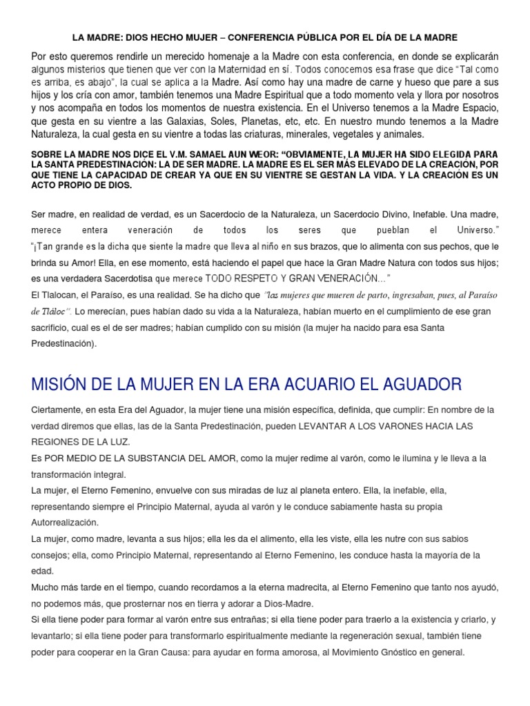 SOBRE LA MADRE NOS DICE EL V.M. SAMAEL AUN WEOR: “OBVIAMENTE, LA MUJER HA SIDO ELEGIDA PARA