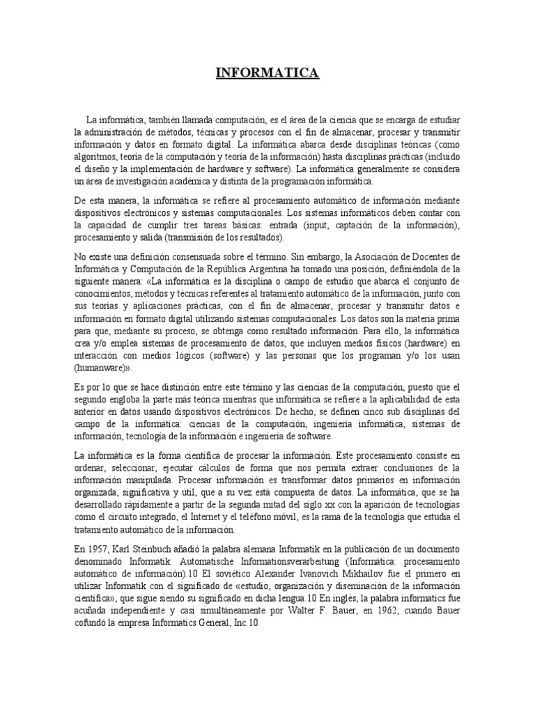 siguiente manera: «La informática es la disciplina o campo de estudio que abarca el conjunto de