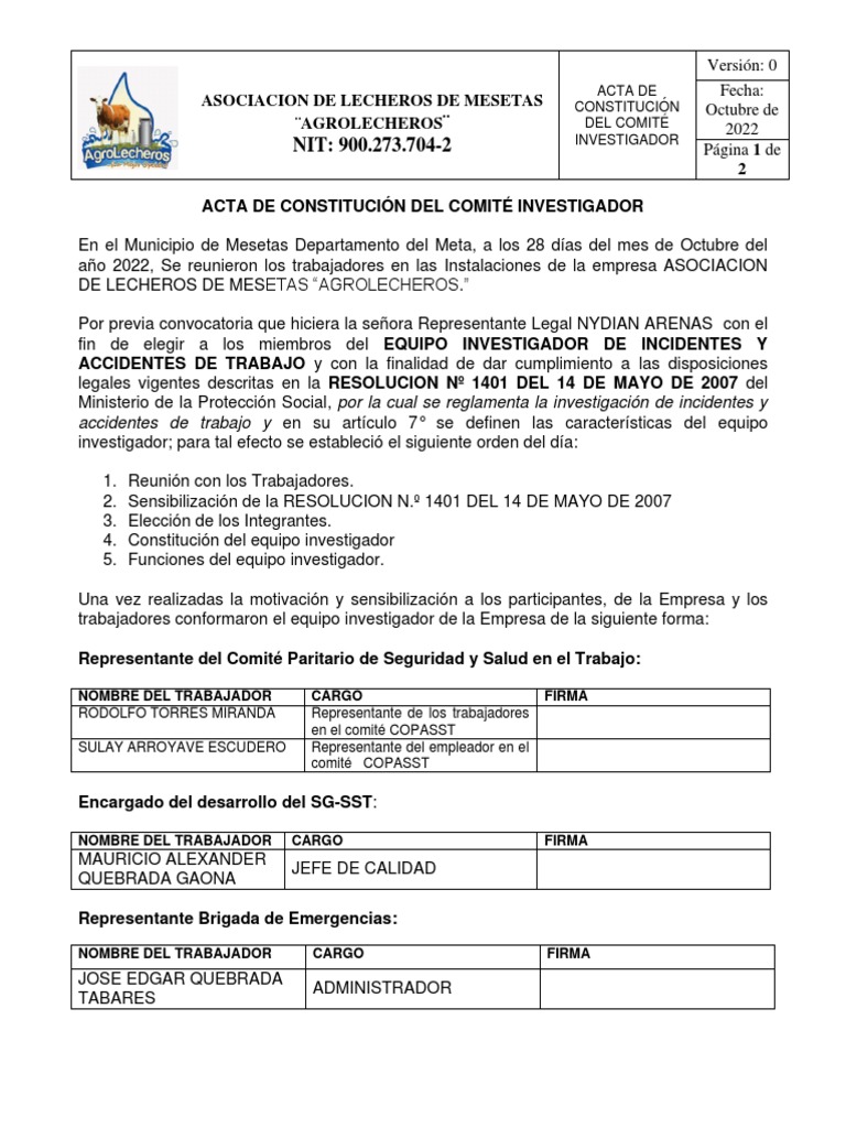 la sesión quedando debidamente constituido el EQUIPO INVESTIGADOR de la Empresa