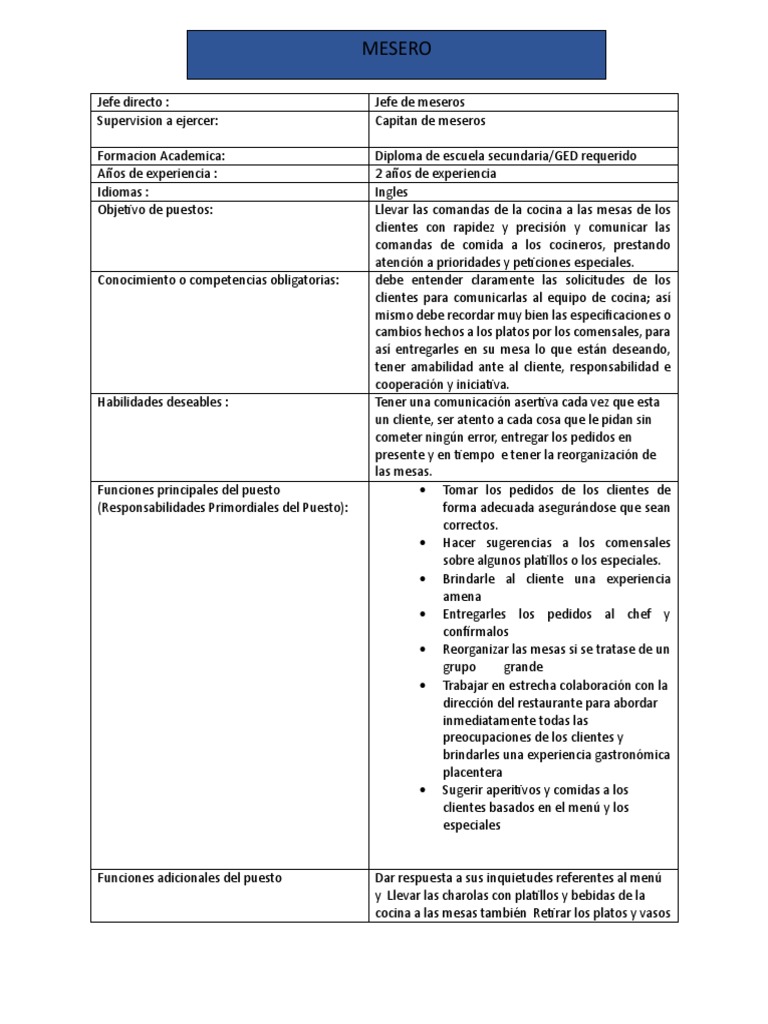 Supervision a ejercer: Capitan de meseros