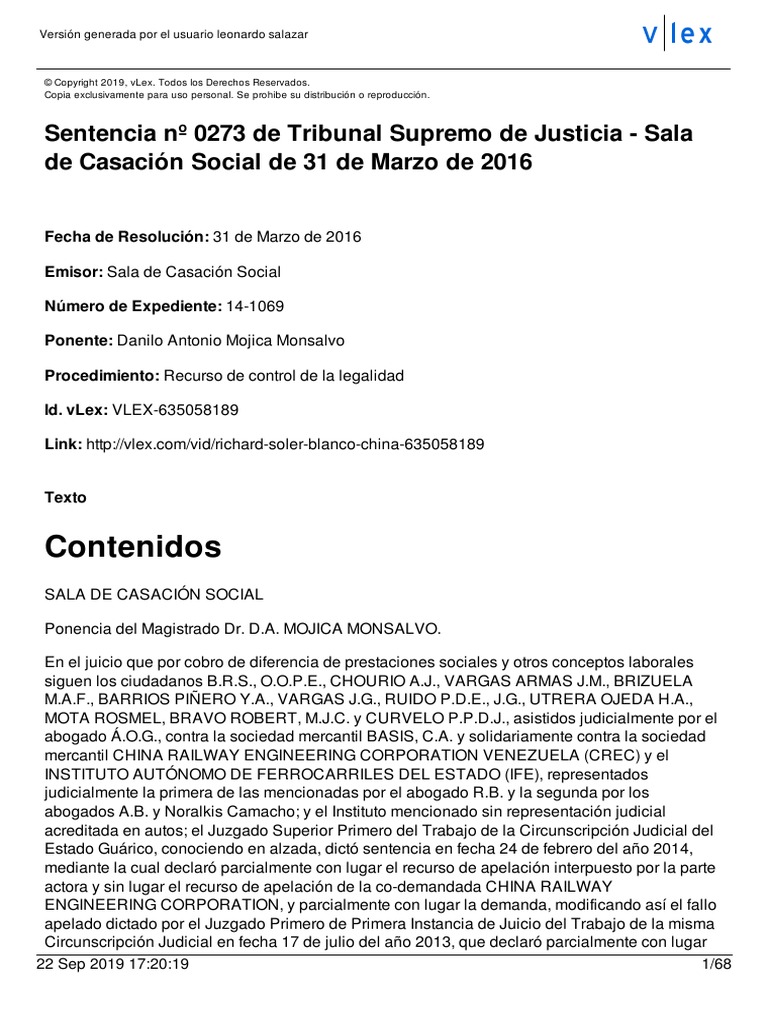 Contenidos: Sentencia Nº 0273 de Tribunal Supremo de Justicia - Sala de Casación Social de 31 de Marzo de 2016