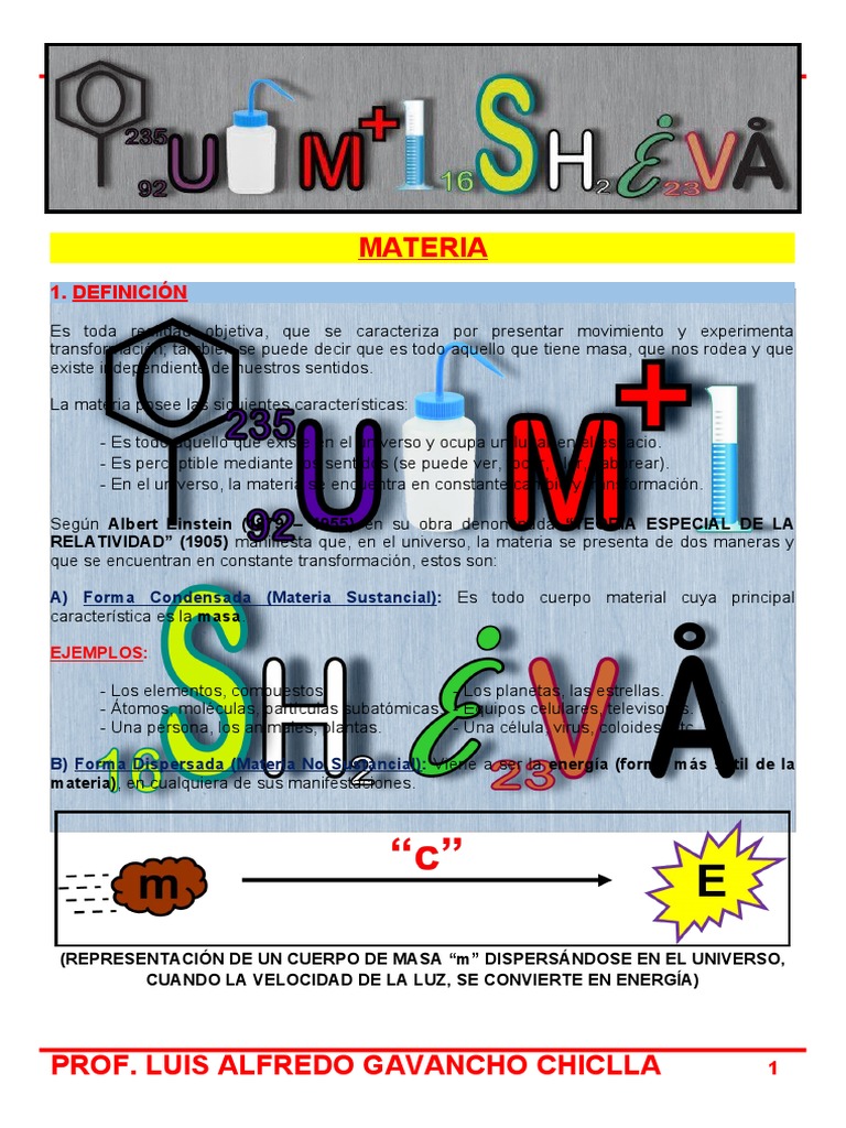 RELATIVIDAD” (1905) manifiesta que, en el universo, la materia se presenta de dos maneras y