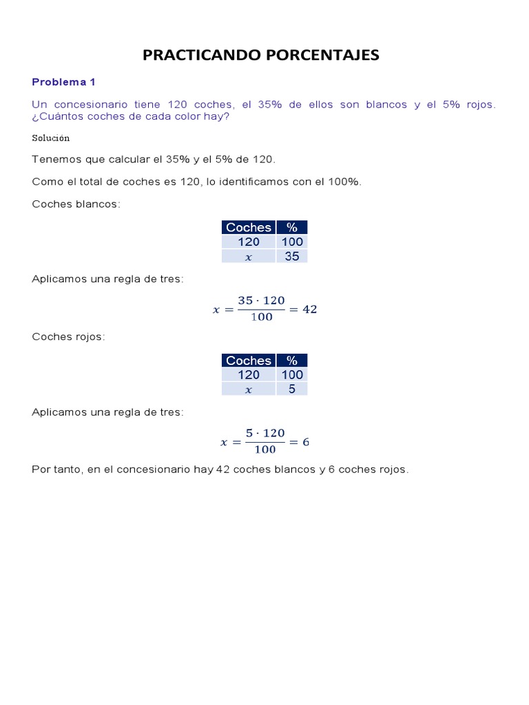 Un concesionario tiene 120 coches, el 35% de ellos son blancos y el 5% rojos.