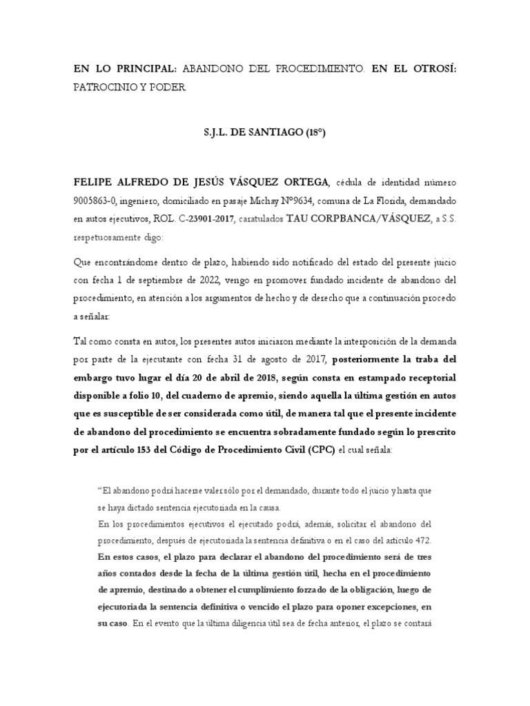 con fecha 1 de septiembre de 2022, vengo en promover fundado incidente de abandono del
