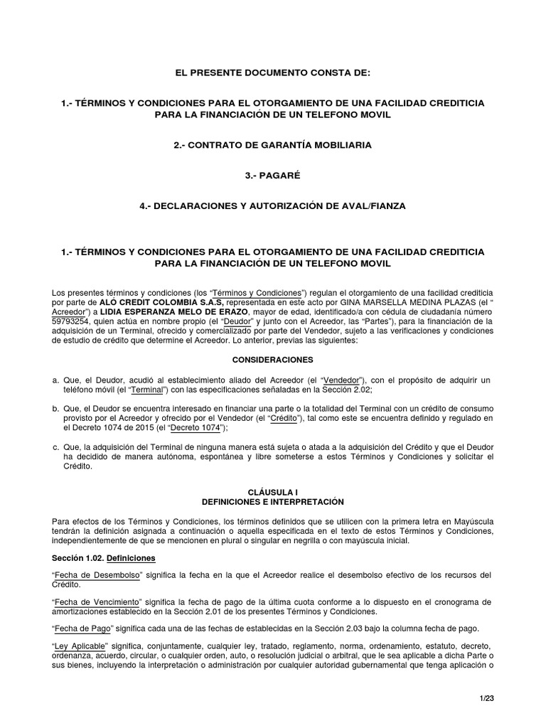 1. He solicitado de ALÓ CREDIT COLOMBIA S.A.S. con N.I.T. 901.546.410-9, (en adelante el Acreedor), un crédito