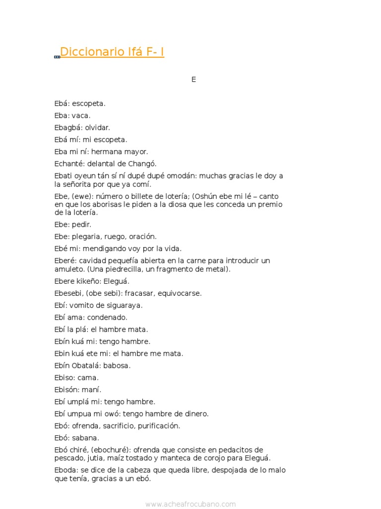 E Eb: escopeta. Eba: vaca. Ebagb: olvidar. Eb m: mi escopeta. Eba mi n: hermana mayor. Echant: delantal de Chang. Ebati oyeun tn s n dup dup omodn: muchas gracias le doy a la seorita por que ya com. Ebe, (ewe): nmero o billete de lotera; (Oshn ebe mi l canto en que los aborisas le piden a la diosa que les conceda un premio de la lotera. Ebe: pedir. Ebe: plegaria, ruego, oracin. Eb mi: mendigando voy por la vida. Eber: cavidad pequefa abierta en la carne para introducir un amuleto. (Una piedrecilla, un fragmento de metal). Ebere kikeo: Elegu. Ebesebi, (obe sebi): fracasar, equivocarse. Eb: vomito de siguaraya. Eb ama: condenado. Eb la pl: el hambre mata. Ebn ku mi: tengo hambre. Ebin ku ete mi: el hambre me mata. Ebn Obatal: babosa. Ebiso: cama. Ebisn: man. Eb umpl mi: tengo hambre. Eb umpua mi ow: tengo hambre de dinero. Eb: ofrenda, sacrificio, purificacin. Eb: sabana. Eb chir, (ebochur): ofrenda que consiste en pedacitos de pescado, jutia, maz tostado y manteca de corojo para Elegu. Eboda: se dice de la cabeza que queda libre, despojada de lo malo que tena, gracias a un eb. www.acheafrocubano.com