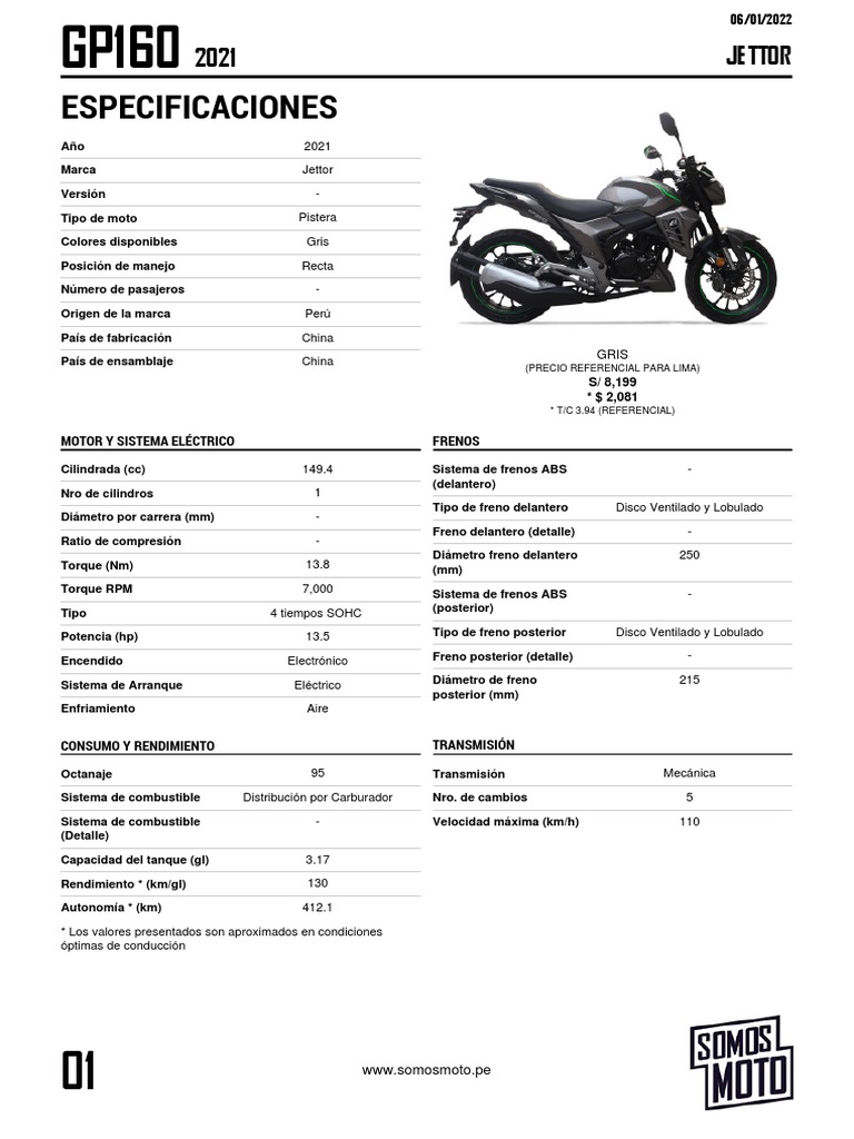 Potencia (hp) 13.5 Tipo de freno posterior Disco Ventilado y Lobulado