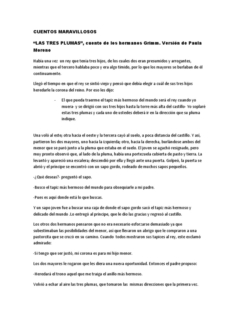 “LAS TRES PLUMAS”, cuento de los hermanos Grimm. Versión de Paula