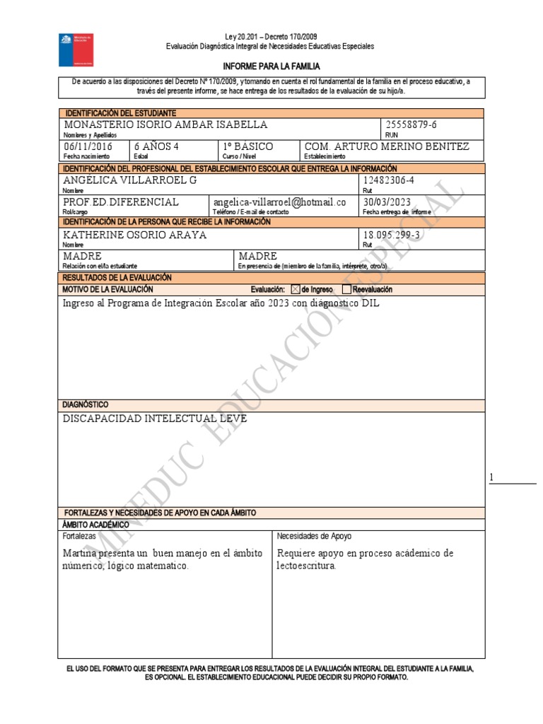 través del presente informe, se hace entrega de los resultados de la evaluación de su hijo/a.