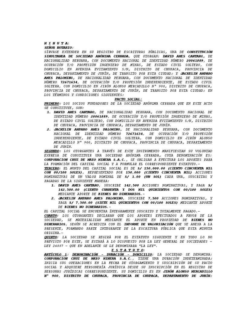 EXPRESA DE CONSTITUIR UNA SOCIEDAD ANÓNIMA CERRADA, CUYA DENOMINACIÓN ES: