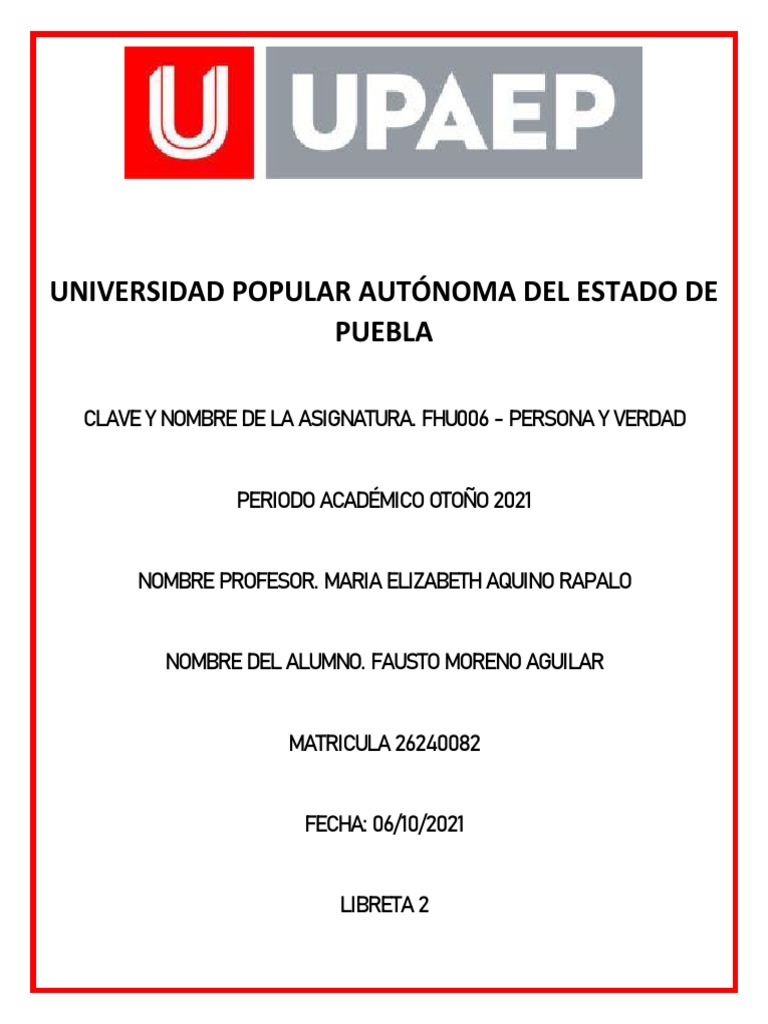 Este documento proporciona detalles sobre una asignatura impartida en la Universidad Popular Autónoma del Estado de Puebla durante el período académico de otoño de 2021. La asignatura se titula "Persona y Verdad", es impartida por la profesora María Elizabeth Aquino Rapalo, y corresponde a la libreta 2 del alumno Fausto Moreno Aguilar con matrícula 26240082.