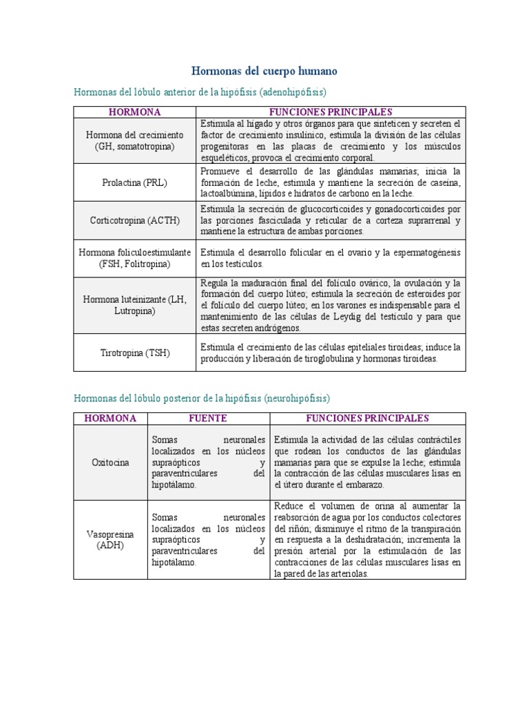 HORMONA FUENTE FUNCIONES PRINCIPALES