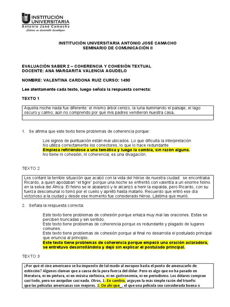 EVALUACIÓN SABER 2 – COHERENCIA Y COHESIÓN TEXTUAL