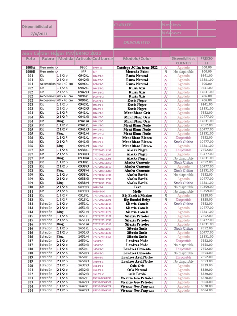 Foto Rubro Medida Artículo Cod barras Modelo/Color Disponibilidad PRECIO