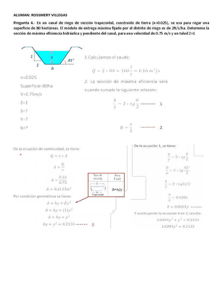 Pregunta 4.- En un canal de riego de sección trapezoidal, construido de tierra (n=0.025), se usa para regar una