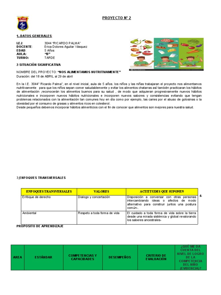 En la I.E. 3044” Ricardo Palma”, en el nivel inicial, aula de 5 años. los niños y las niñas trabajaran el proyecto nos alimentamos