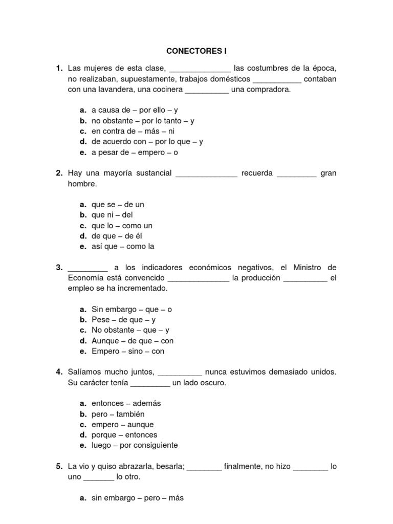 Las mujeres de esta clase, ______________ las costumbres de la poca, no realizaban, supuestamente, trabajos domsticos ___________ contaban con una lavandera, una cocinera __________ una compradora. a. b. c. d. e. a causa de por ello y no obstante por lo tanto y en contra de ms ni de acuerdo con por lo que y a pesar de empero o