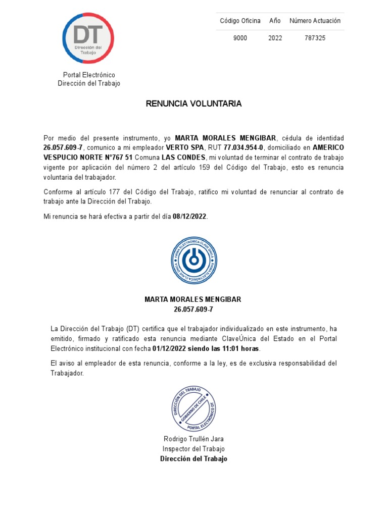 Conforme al artículo 177 del Código del Trabajo, ratifico mi voluntad de renunciar al contrato de