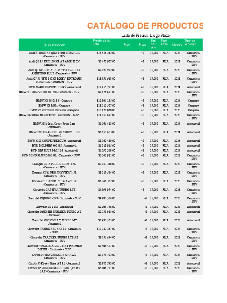 Id. de producto lista Plan Plazo por Tasa Modelo vehículo