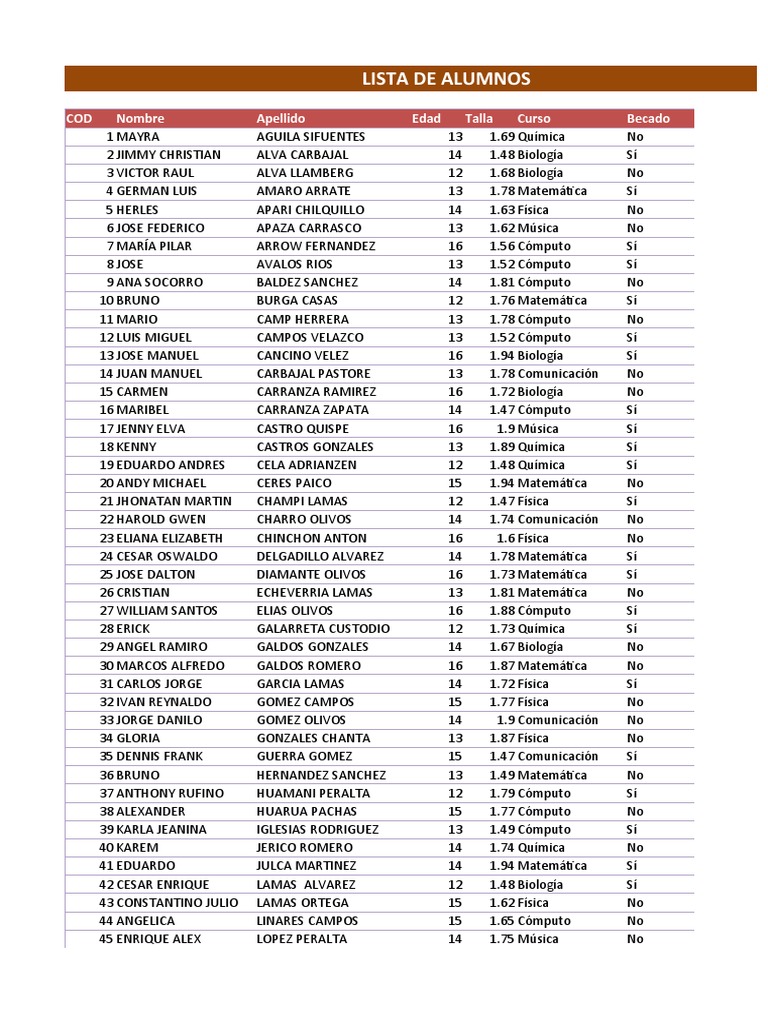 COD Nombre Apellido Edad Talla Curso Becado