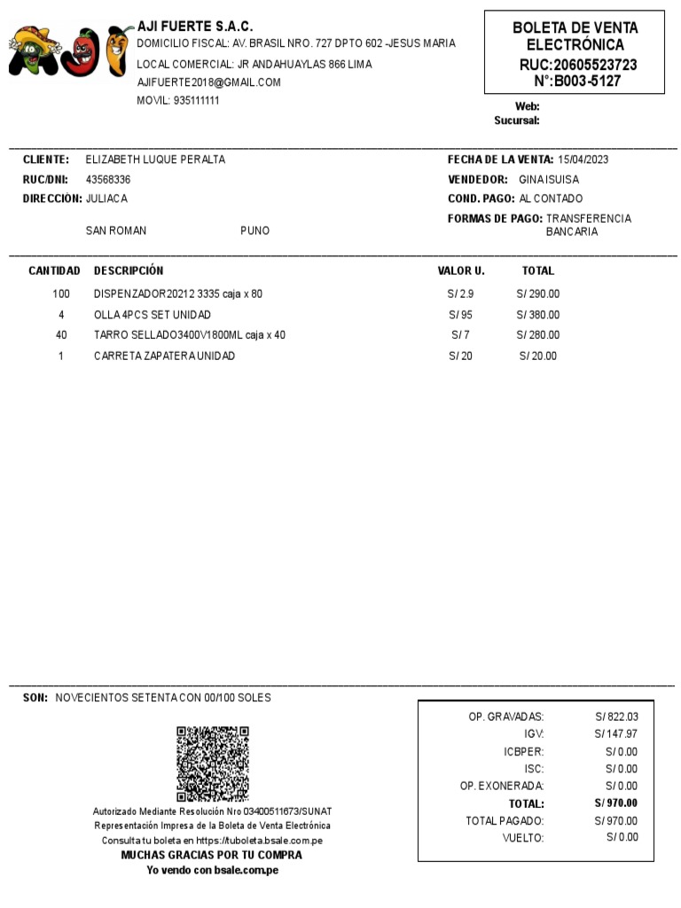 Representación Impresa de la Boleta de Venta Electrónica TOTAL PAGADO: S/ 970.00
