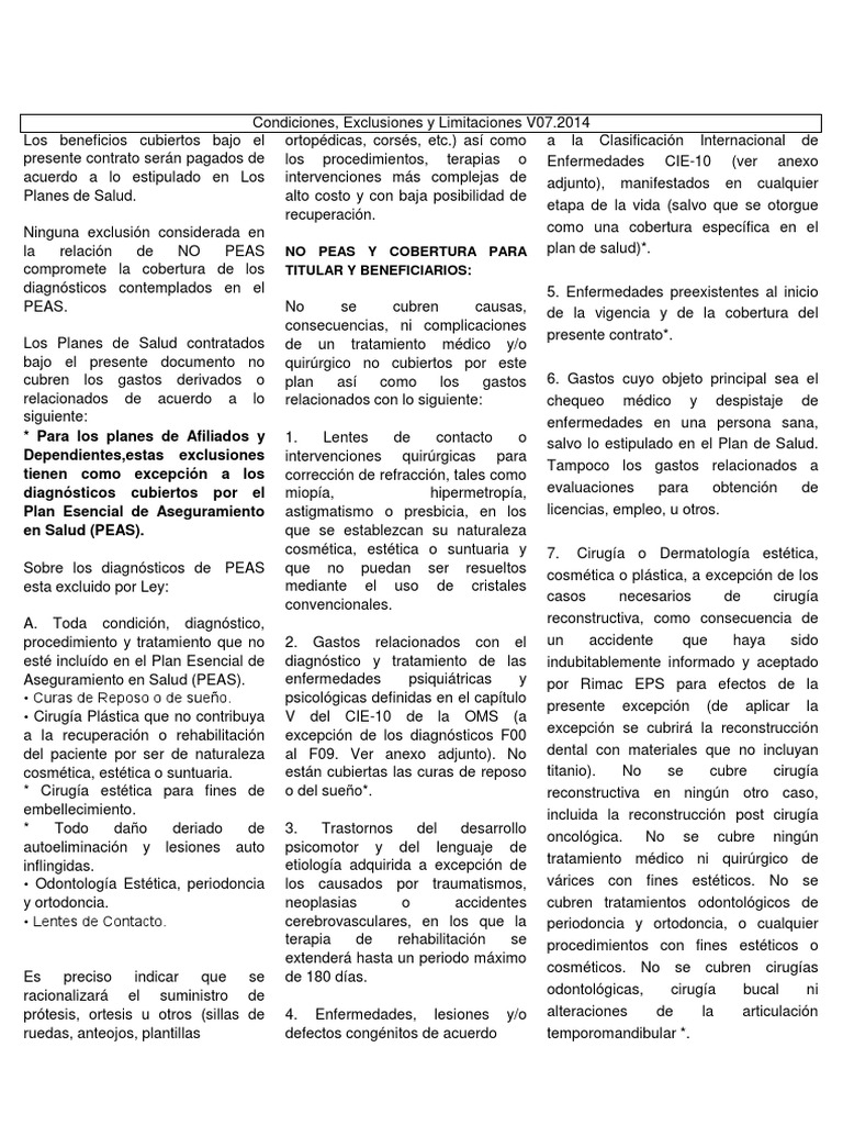 Aseguramiento en Salud (PEAS). enfermedades psiquiátricas y por Rimac EPS para efectos de la
