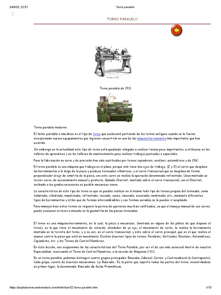 El torno paralelo o mecánico es el tipo de torno que evolucionó partiendo de los tornos antiguos cuando se le fueron