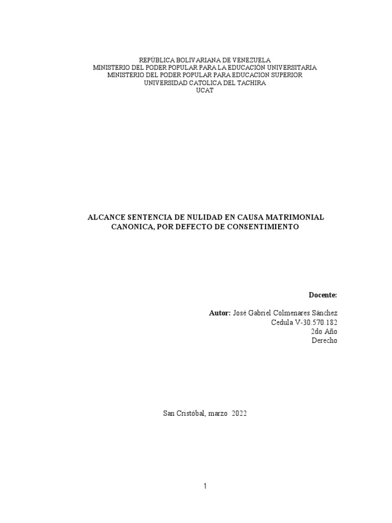 trabajo presenta un estudio sobre la Nulidad de Matrimonio canónico por