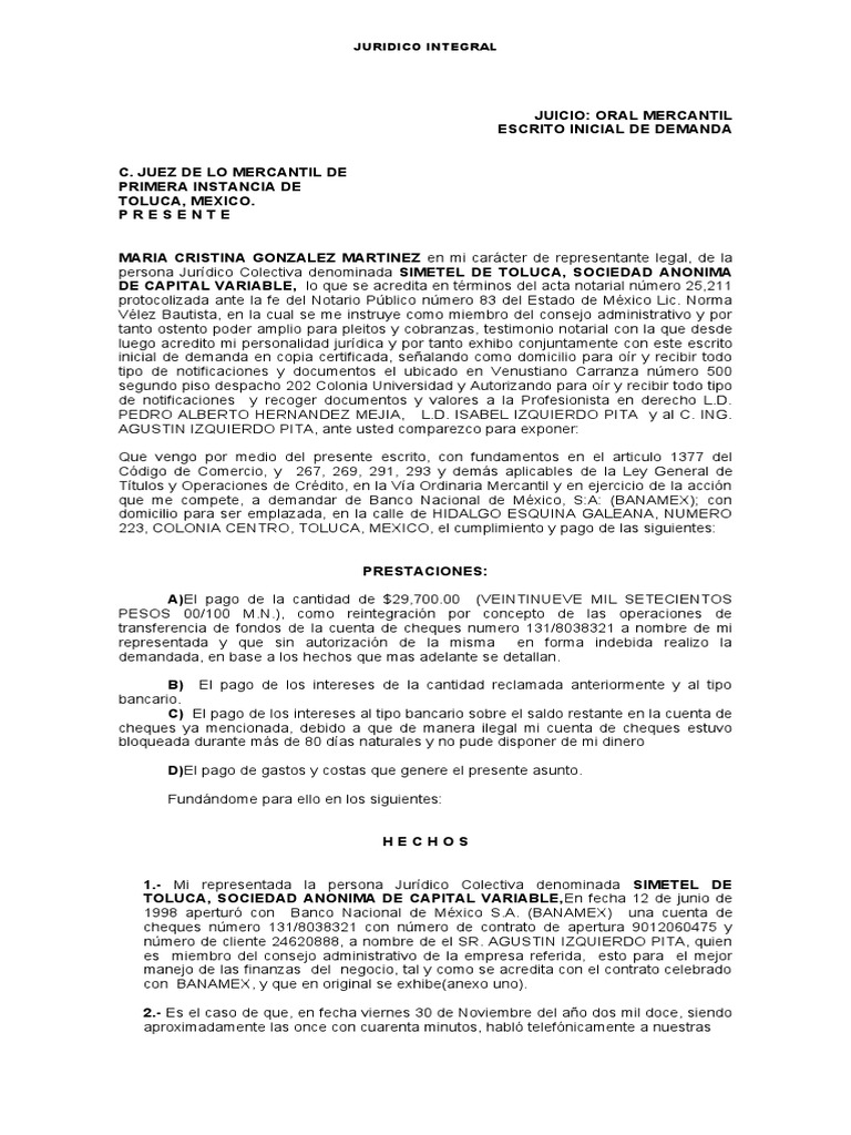 que me compete, a demandar de Banco Nacional de México, S:A: (BANAMEX); con