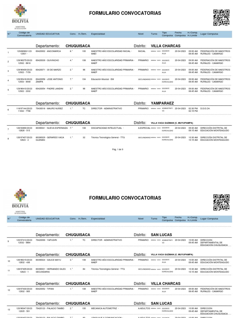 105/97911/20/23 70470052 - PAMPAS DE LEQUE 1.° 108 MAESTRO AÑO ESCOLARIDAD PRIMARIA - PRIMARIO MAÑANA - TARDE DOCENTE 21-04-2023 09:00 AM D.D.E. CHUQUISACA