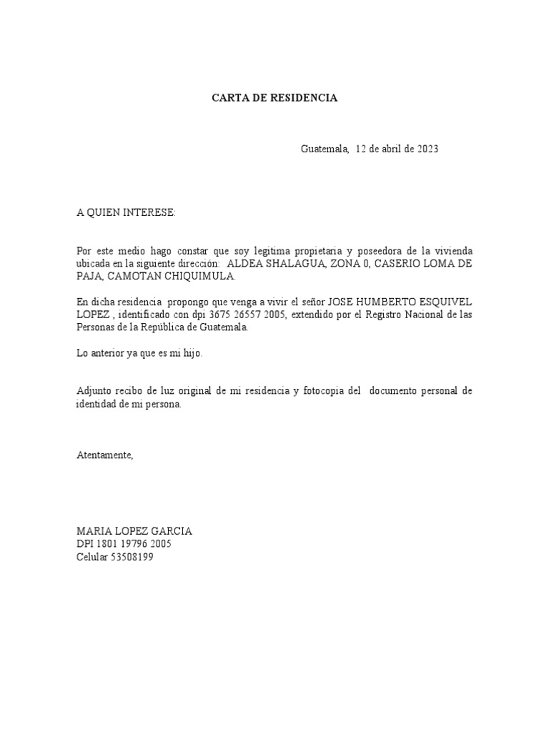 CARTA DE RESIDENCIA