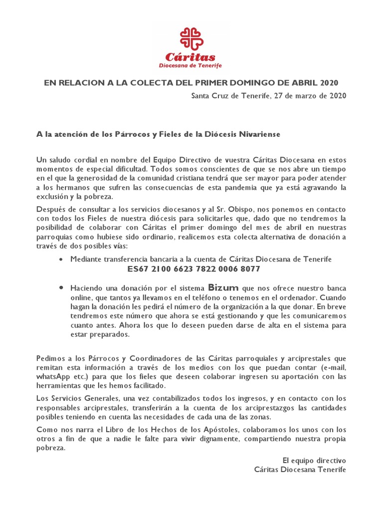 posibilidad de colaborar con Cáritas el primer domingo del mes de abril en nuestras