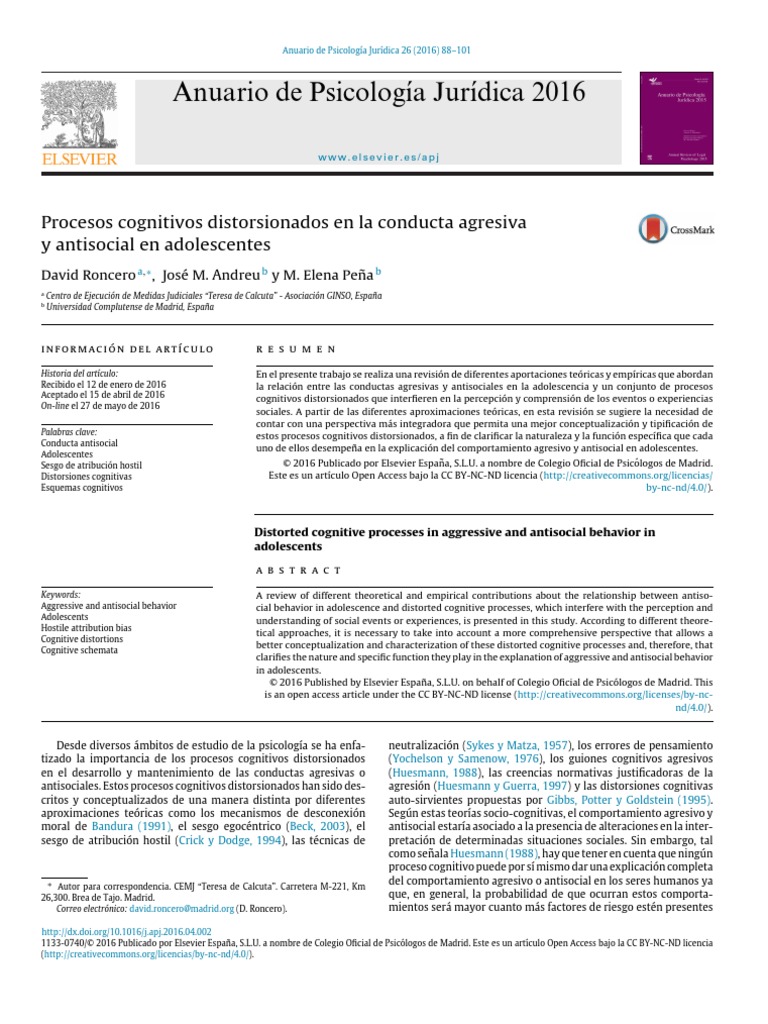 antisociales. Estos procesos cognitivos distorsionados han sido des- agresión (Huesmann y Guerra, 1997) y las distorsiones cognitivas