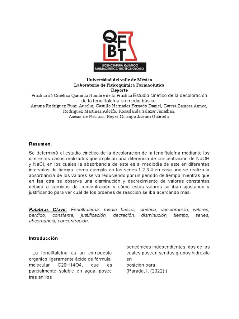 Palabras Clave: Fenolftaleína, medio básico, cinética, decoloración, valores,