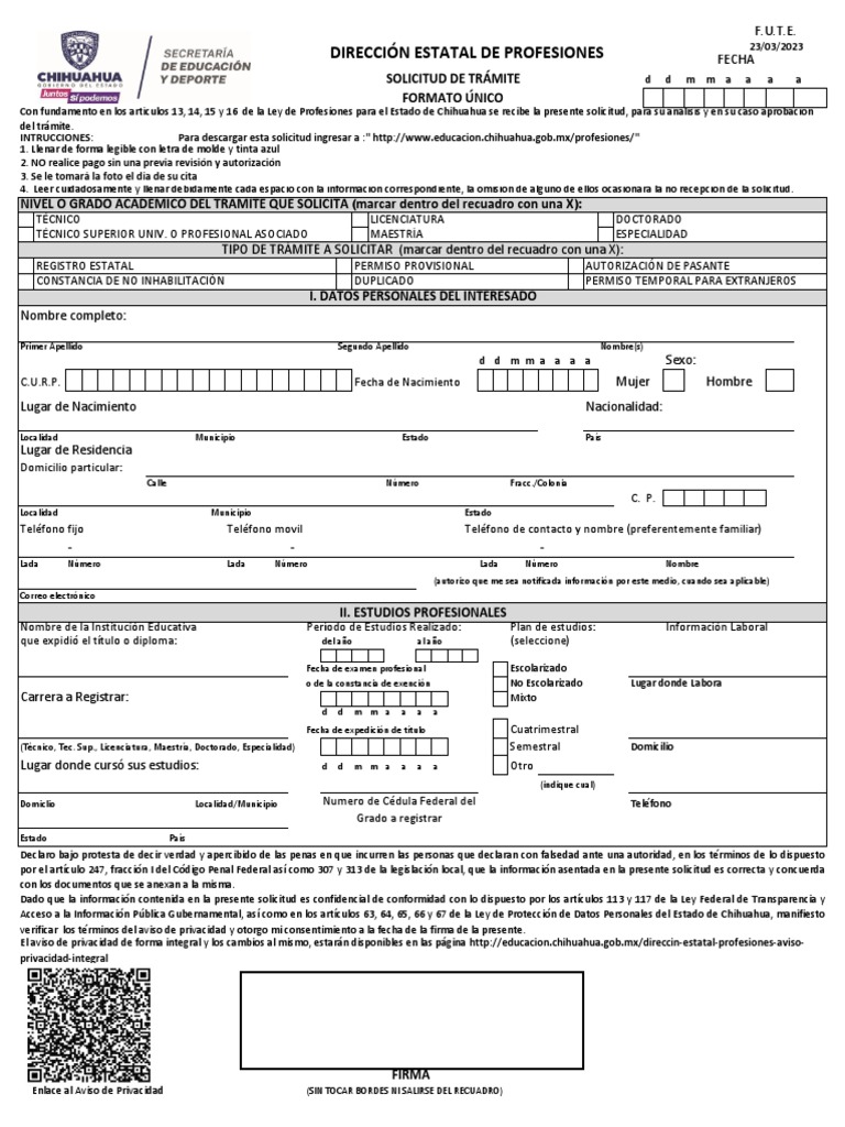 El aviso de privacidad de forma integral y los cambios al mismo, estarán disponibles en las página http://educacion.chihuahua.gob.mx/direccin-estatal-profesiones-aviso-