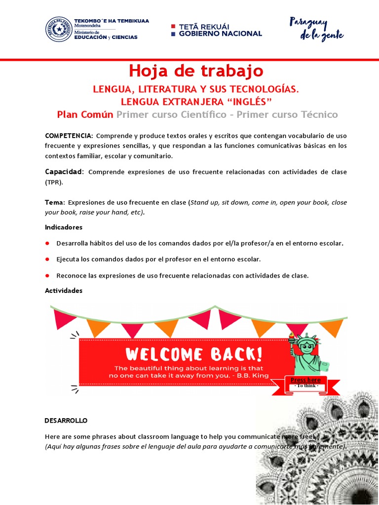 ● Reconoce las expresiones de uso frecuente relacionadas con actividades de clase.