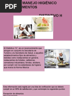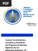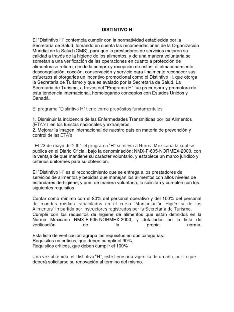 de la Organizacin Mundial de la Salud (OMS), para que lo prestadores de servicios mejoren su calidad a travs de la higiene de los alimentos, y de una manera voluntaria se sometan a una verificacin de las operaciones en cuanto a proteccin de alimentos se refiere, desde la compra y recepcin de estos, el almacenamiento, descongelacin, coccin, conservacin y servicio para finalmente reconocer sus esfuerzos al otorgarles un incentivo promocional como el Distintivo H, que otorga la Secretara de Turismo y que es avalado por la Secretara de Salud. La Secretaria de Turismo, a travs del "Programa H" fue precursora y promotora de esta tendencia internacional, homologando conceptos con Estados Unidos y Canad. El programa Distintivo H tiene como propsitos fundamentales: 1. Disminuir la incidencia de las Enfermedades Transmitidas por los Alimentos (ETAs) en los turistas nacionales y extranjeros. 2. Mejorar la imagen internacional de nuestro pas en materia de prevencin y control de las ETAs. El 23 de mayo de 2001 el programa H se eleva a Norma Mexicana la cual se publica en el Diario Oficial, bajo la denominacin: NMX-F-605-NORMEX-2000, con la ventaja de que mantiene su carcter voluntario, y establece un marco jurdico y criterios uniformes para su obtencin. El "Distintivo H" es el reconocimiento que se entrega a los prestadores de servicios de alimentos y bebidas que manejan los alimentos con altos niveles de estndares de higiene; y que, de manera voluntaria, lo solicitan y cumplen con los siguientes requisitos: Contar como mnimo con el 80% del personal operativo y del 100% del personal de mandos medios capacitados en el curso Manipulacin Higinica de los Alimentos impartido por instructores registrados por la Secretara de Turismo. Cumplir con los requisitos de higiene de alimentos que estn definidos en la Norma Mexicana NMX-F-605-NORMEX-2000, y detallados en la lista de verificacin de la propia norma. Esta lista de verificacin agrupa los requisitos en dos categoras: Requisitos no crticos, que deben cumplir el 90%. Requisitos crticos, que deben cumplir el 100% Una vez obtenido, el Distintivo H, este tiene una vigencia de un ao, por lo que deber solicitarse su renovacin al trmino del mismo.