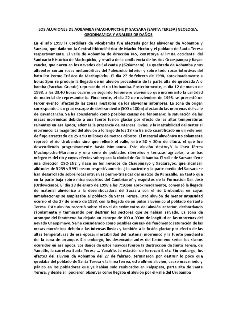 LOS ALUVIONES DE AOBAMBA (MACHUPICCHU)Y SACSARA (SANTA TERESA) GEOLOGIA,
