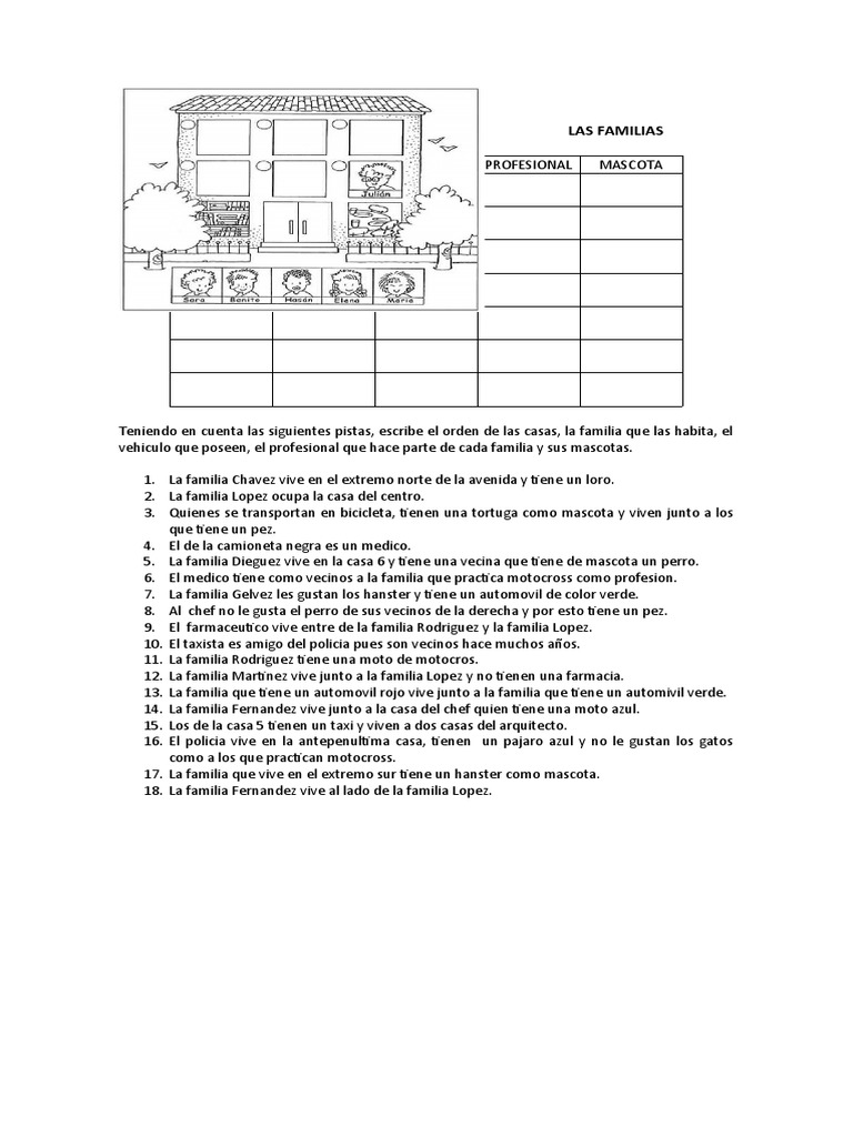 Teniendo en cuenta las siguientes pistas, escribe el orden de las casas, la familia que las habita, el