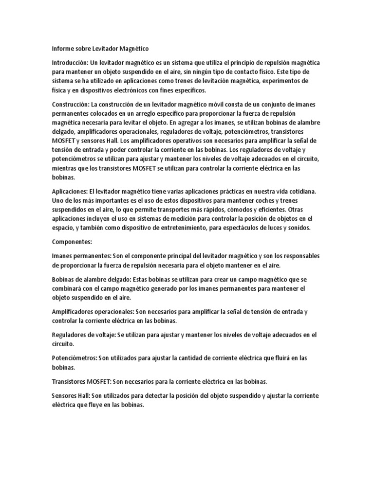 Introducción: Un levitador magnético es un sistema que utiliza el principio de repulsión magnética