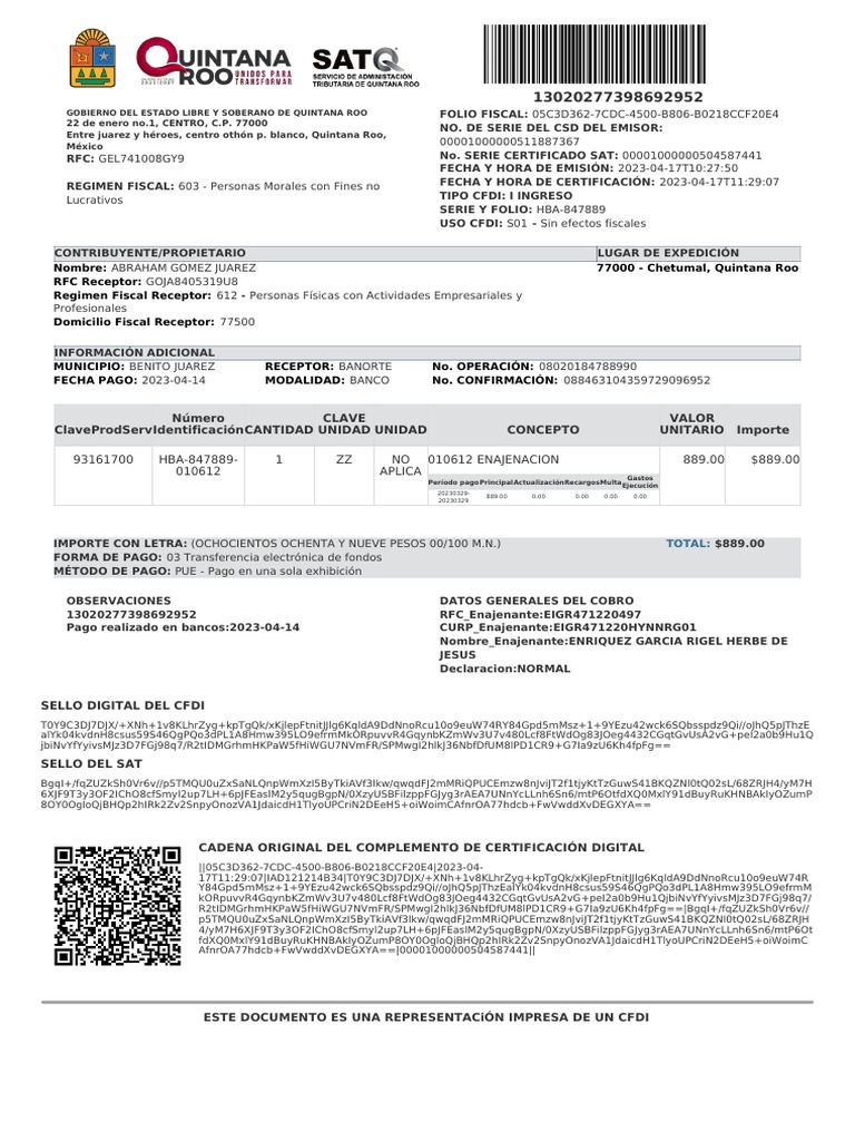 Pago realizado en bancos:2023-04-14 CURP_Enajenante:EIGR471220HYNNRG01