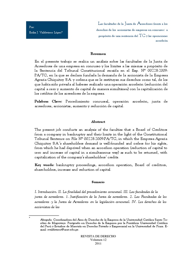 Palabras Clave: Procedimiento concursal, operación acordeón, junta de