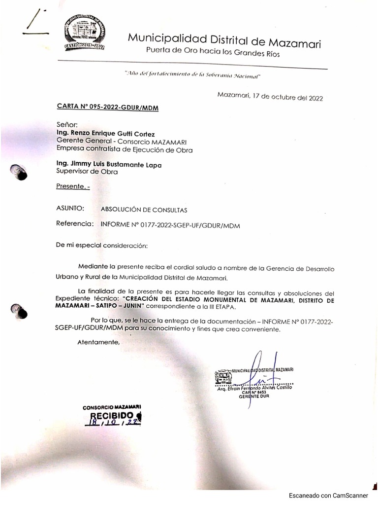 hacerle llegar las consultas y absoluciones del Expediente técnico: "*CREACION DEL ESTADIO