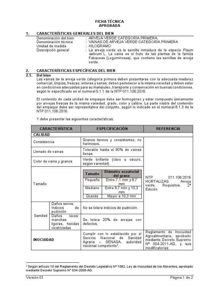 establecido en la norma NTP 011.106:2016, por ejemplo: Arveja verde categoría primera - tamaño