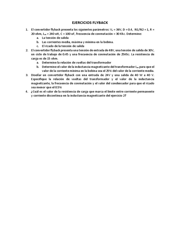 1. El convertidor flyback presenta los siguientes parámetros: Vs = 36V, D = 0.4, N1/N2 = 1, R =
