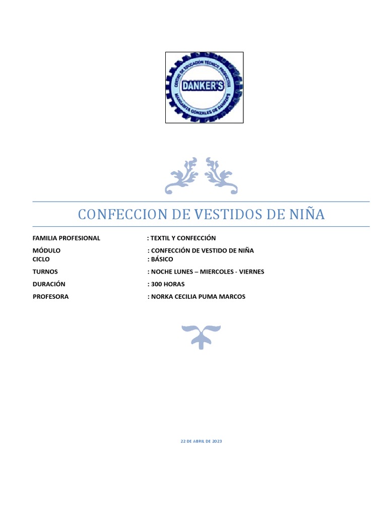 Este documento proporciona información sobre un curso de confección de vestidos de niña, incluyendo su familia profesional, módulo, ciclo, turnos, duración e instructora. El curso se centra en técnicas como la abertura de escotes, caída de escotes delanteros y espaldas, y extensión de sisas.