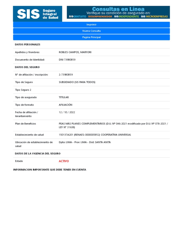 podrán recibir atenciones de salud bajo la cobertura del SIS hasta la fecha límite indicada en la consulta en línea.