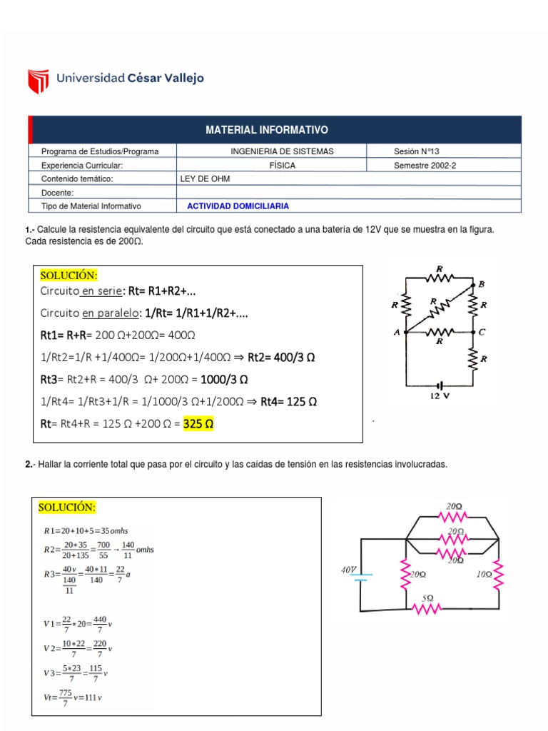 2.- Hallar la corriente total que pasa por el circuito y las caídas de tensión en las resistencias involucradas.