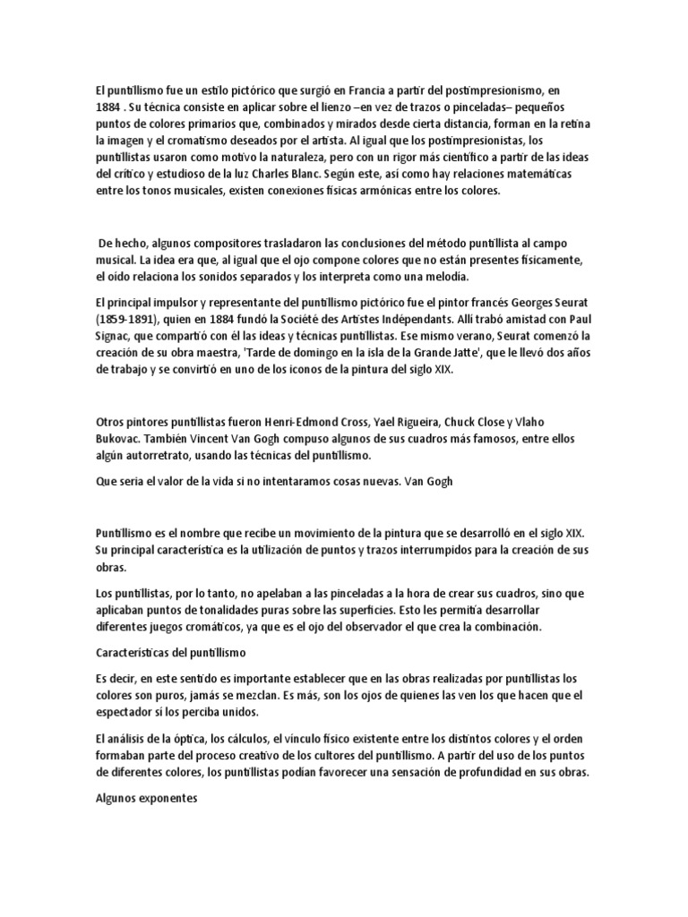 El puntillismo fue un estilo pictórico que surgió en Francia a partir del postimpresionismo, en